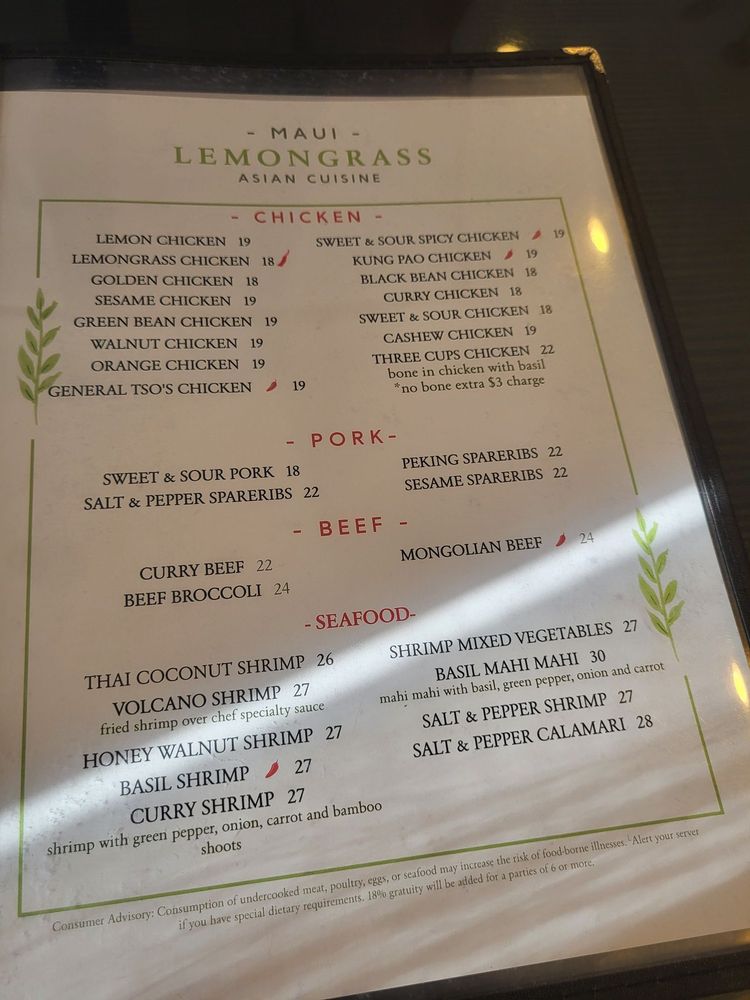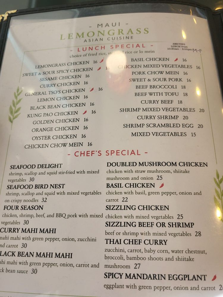 Maui Lemongrass, a Chinese restaurant located in Kahului, offers a diverse menu with a mix of traditional and innovative dishes. Customer reviews praise the flavorful options like lemongrass chicken, Basil chicken, Thai ginger coconut soup, sweet n sour pork, and Mongolian beef. The atmosphere is casual and welcoming, making it great for group gatherings or family dinners. The service is friendly and attentive, with staff members who go the extra mile to ensure a pleasant dining experience. Prices are reasonable for the quality and portion sizes. The restaurant also offers takeout and delivery options, perfect for those looking to enjoy their delicious meals at home. Overall, Maui Lemongrass is a hidden gem on Maui, serving up authentic Chinese cuisine with a modern twist.